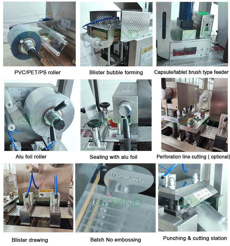 Pembentukan gelembung blister-dari PVC atau film PET-Kapsul Tablet Candy Feeding Otomatis oleh Tipe Kuas Pengumpan Universal-- Menyegel dengan Alu Foil --- Pemotongan Garis Perforasi sebagai Opsional-Batch Tidak Ada Embossing --- Pemotongan dan Output Blister Terakhir